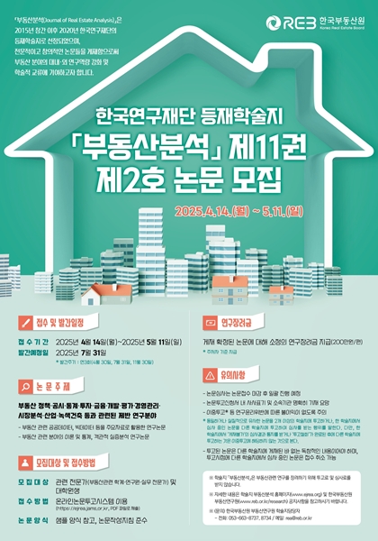 한국부동산원 관계자는 "등재학술지 `부동산분석` 논문 모집을 통해 연구자의 독창적인 연구를 지원하고 심도 있는 결과가 부동산산업 발전에 기여할 수 있도록 노력하겠다"라고 말했다.