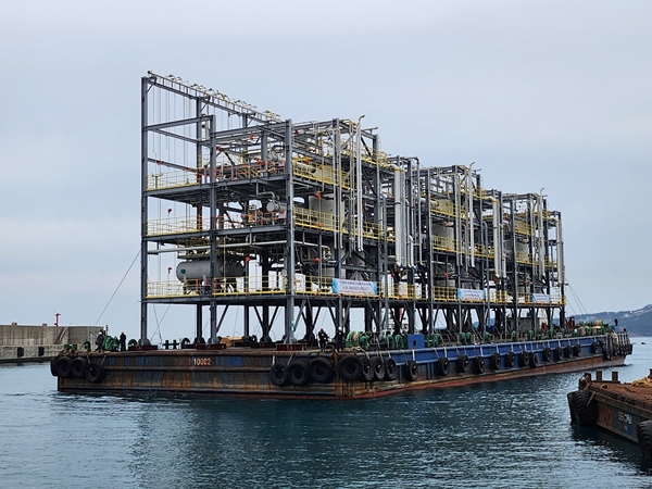 이번에 설치된 PAU 모듈은 길이 22.8m, 폭 16.3m, 높이 23m, 무게 327톤의 대형 구조물로 총 3기가 제작됐다. 현대엔지니어링은 전남 목포에서 제작한 PAU 모듈을 목포 대불항에서 선적한 뒤 남해를 따라 이틀간 470km를 운송해 울산 현장에 안전하게 설치했다.