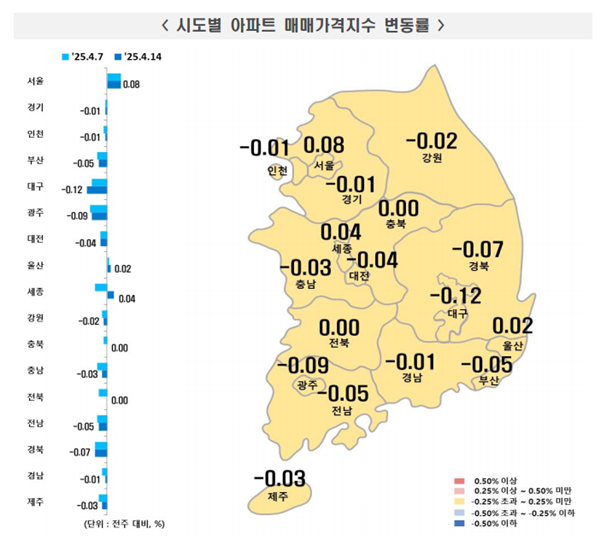 [아유경제=권혜진 기자] 최근 한국부동산원이 발표한 `주간아파트 가격동향`에 따르면 2025년 4월 2주(지난 14일 기준) 전국 아파트값은 하락(-0.01%)을 기록했다. 수도권은 상승폭 확대, 서울은 상승폭 유지, 지방은 하락폭 축소한 상황이다.
