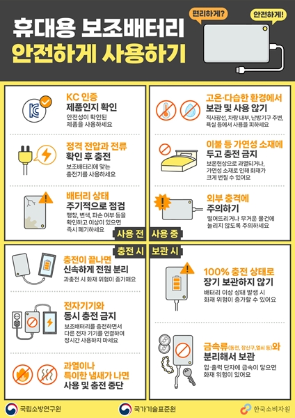 이에 3개 기관은 휴대용 보조배터리의 안전한 사용을 위해 ▲충전 완료 후 신속하게 전원을 분리할 것 ▲외부 충격 등에 주의할 것 ▲금속류와 분리해서 보관할 것 ▲KC 인증 제품을 사용할 것 등을 당부했다.