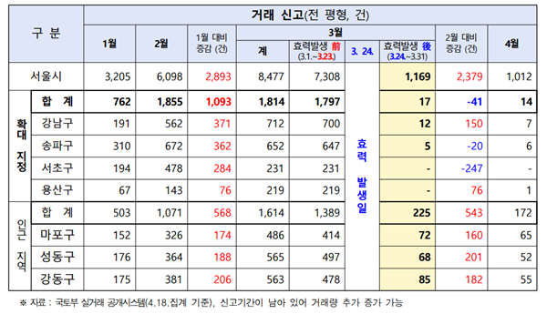 시는 지난 2월 13일 잠실ㆍ삼성ㆍ대치ㆍ청담을 토지거래허가구역을 해제했다가 부동산시장이 과열 양상을 보이자, 한 달여만인 지난달(3월) 24일 강남 3구와 용산구 아파트 전체를 토지거래허가구역으로 확대 지정한 바 있다.