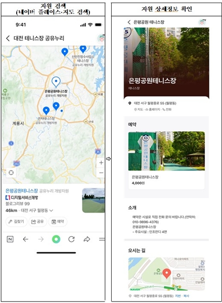 예약은 각 민간 앱에서 다른 시설ㆍ서비스를 예약하는 방식과 동일하다. 네이버 지도에서는 `풋살장`, `회의실` 등 시설명을 검색하면 예약 가능한 자원이 지도에 표시돼 원하는 날짜와 시간대를 선택해 예약할 수 있다. 카카오톡에서는 하단의 `더보기`ㆍ·`예약하기` 메뉴를 통해 자원을 검색한 후 날짜 등을 선택해 신청하면 된다.