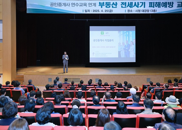 지난 25일 시는 시청 대강당에서 지역 공인중개사 400여 명을 대상으로 `공인중개사 연수교육과 연계한 부동산 전세사기 피해예방 교육`을 실시했다고 밝혔다.