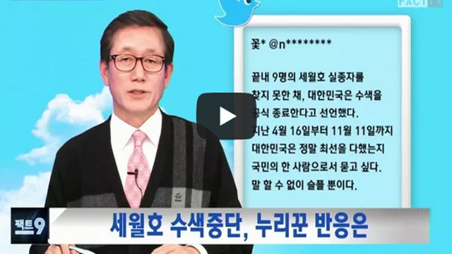 ‘뜨거운SNS’순서입니다. 하루 동안 온라인을 뜨겁게 달군 뉴스에 대한, 누리꾼들의 생각을 알아보는 시간이죠. 오늘의 화제는 단연 세월호 수색 중단 발표였습니다. 앞서 팩트나인 간추린 뉴스에서 보도한 것처럼 오늘 오전 이주영 해양수산부 장관의 담화문에 이어, 진도 팽목항에서 세월호 실종자 가족들이 입장을 밝혔습니다.