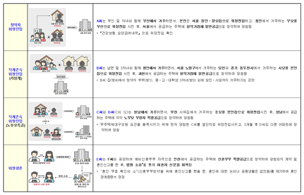 적발된 사례는 본인ㆍ직계존속 위장전입을 중심으로 위장결혼ㆍ이혼, 청약자격 조작, 불법 전매 등 다양한 형태로 나타났다.