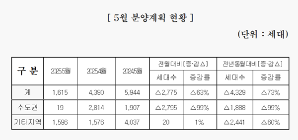 이는 전월(4390가구) 대비 2775가구(63%) 감소했으며, 전년 동월(5944가구)과 비교하면 4329가구(73%)나 줄어든 수치다.
