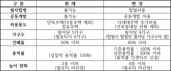 주요 규제 완화 내용으로는 ▲필지 합병 및 공동개발 허용 ▲건축물대장 전환을 제외한 다세대주택 허용 ▲가구수 완화(기존 5가구에서 6가구로 확대) ▲건폐율 완화(50% 이하에서 60% 이하로 조정) ▲용적률 완화(실질적 용적률 150% 이하에서 기준용적률 160% 이하ㆍ인센티브 적용 시 상한용적률 200% 이하) ▲건축물 높이 완화(지상 3층 이하에서 4층 이하로 완화) 등이 포함됐다.