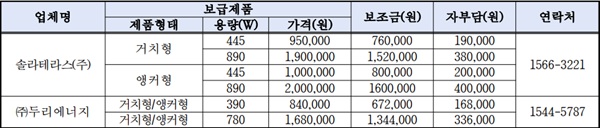 설치 비용은 제품형태 및 용량에 따라 84만 원~100만 원(390W 또는 445W 모듈 1장 기준)이 소요되는데, 시로부터 80%를 지원받으면 자부담금은 16만8000원~20만 원이다.