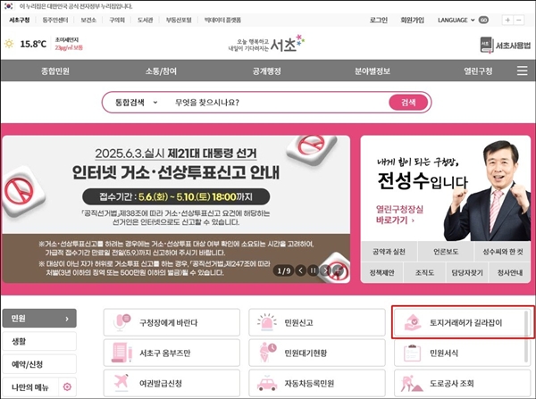 [아유경제=조명의 기자] 서울 서초구는 토지거래허가제 확대 시행에 따른 구민 불편을 해소하고자 구 누리집에 `토지거래허가 길라잡이` 시스템을 구축ㆍ운영한다고 이달 11일 밝혔다.