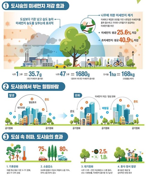한편, 도시숲은 단순한 녹지 확대를 넘어 도시 생태계 회복의 핵심 인프라로 주목받고 있다. 1㏊의 도시숲은 연간 미세먼지 약 168㎏을 흡수하고 이산화탄소 6.9t을 정화하며, 여름철 평균기온을 3~7℃ 낮추는 효과가 있다고 알려져 있다. 강우 시 빗물 유출도 완화시켜 도시형 홍수 예방에도 기여한다.