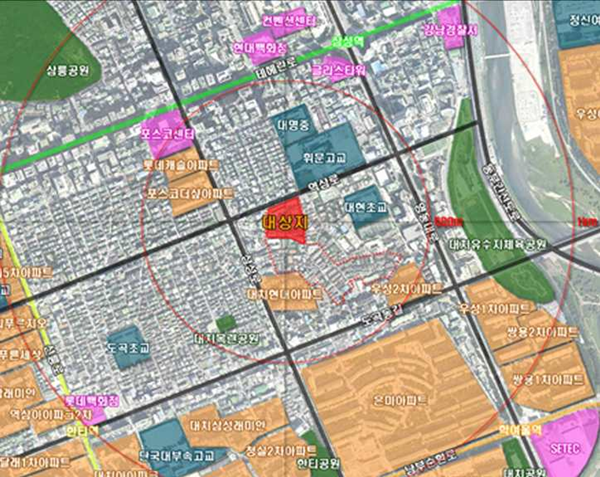 한편, 사업지는 지하철 2호선 삼성역이 걸어서 10분 거리에 있고 사업지 주변 테헤란로, 영동대로, 동부간선로 등을 이용해 시내 외곽으로 이동이 수월해 좋은 교통 인프라를 갖추고 있다. 여기에 단지 인근에 코엑스, 호텔, 백화점, 봉은사 등이 도보권 내에 위치해 있고 사업지 반경 500m 이내에 다수의 명문 초ㆍ중교가 위치해 있다.