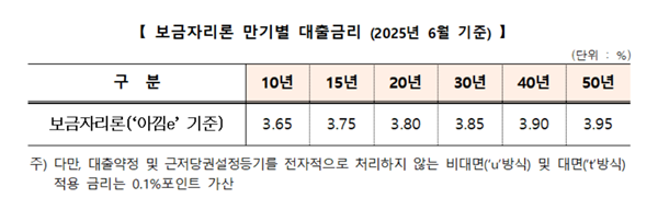 이에 `아낌e-보금자리론` 기준으로 연 3.65(10년)~3.95%(50년)가 적용된다.