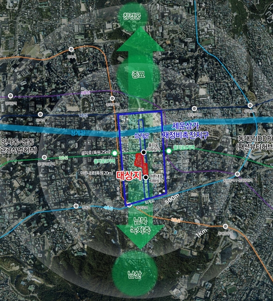 앞서 시는 2022년 4월 도심 내 고층 빌딩과 나무숲이 조화를 이루는 `녹지생태도심` 구현을 목표로 고밀 복합 개발과 함께 충분한 녹지공간을 확보하는 `녹지생태도심 재창조 전략`을 발표한 바 있다. 이러한 전략에 맞춰 지난해 6월에는 종묘~퇴계로 일대 남북녹지축 실현을 목표로 세운지구 내 약 13만6000㎡의 녹지를 단계적으로 확보하도록 세운재정비촉진계획을 변경하고 삼풍상가와 PJ호텔을 공원화하는 도심공원 조성사업을 추진 중에 있다.