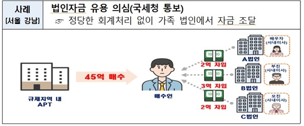 실제 매수인 A씨의 경우 서울 강남구에 소재한 아파트를 45억 원에 매수하면서 배우자와 아버지, 어머니가 각각 사내이사로 있는 법인에서 2억 원, 3억 원, 2억 원 등 총 7억 원을 빌렸다. 국토부는 해당 금액의 정당한 회계처리가 확인되지 않아 법인자금 유용이 의심된다며 해당 사례를 국세청에 통보할 계획이다.