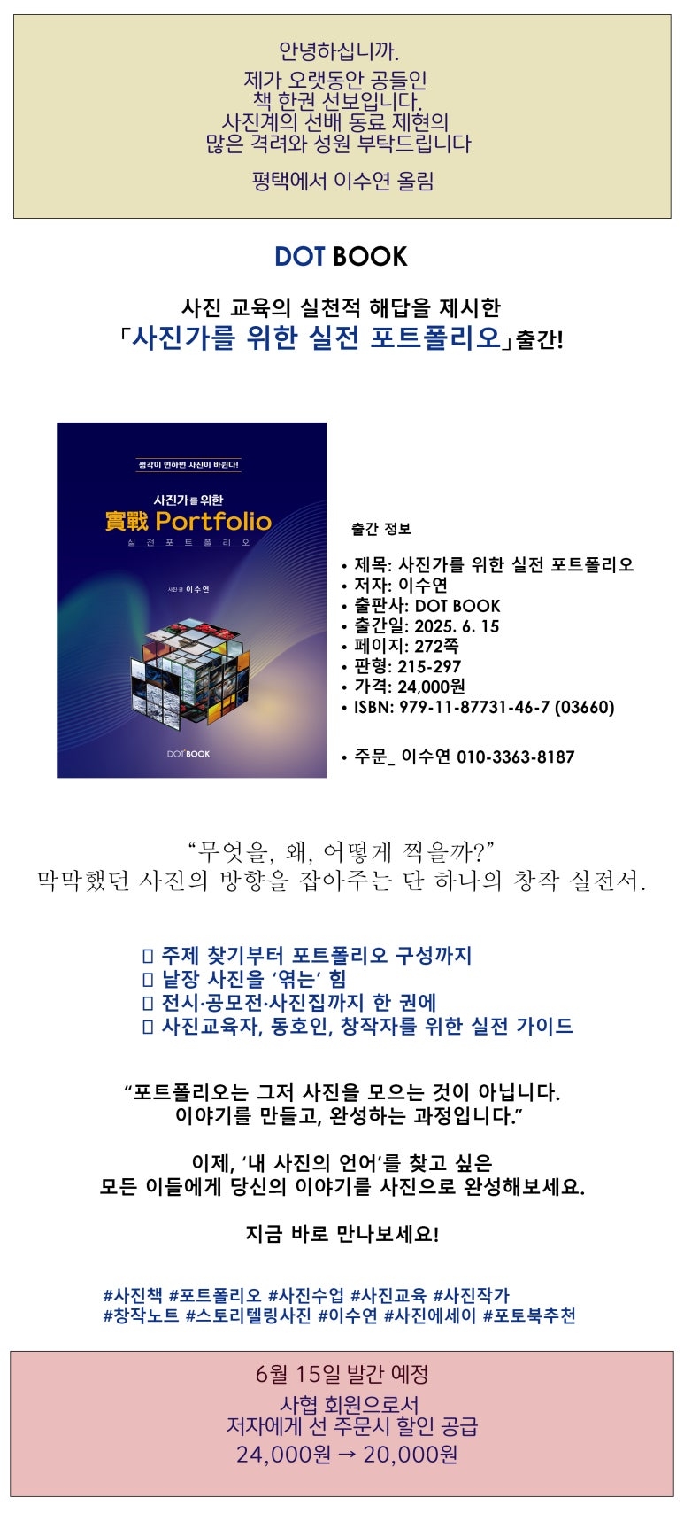 * 실력파 사진가 이수연 작가가 자신만의 예술을 구축하는 길을 책 “사진가를 위한 실전 포트폴리오”를 펴냈다. 이 책은 막막했던 사진의 방향을 잡아주는 창작 실전서이다. 서점에서 주문하면 되고 직접 작가에게 연락해도 책을 받아볼 수 있다.