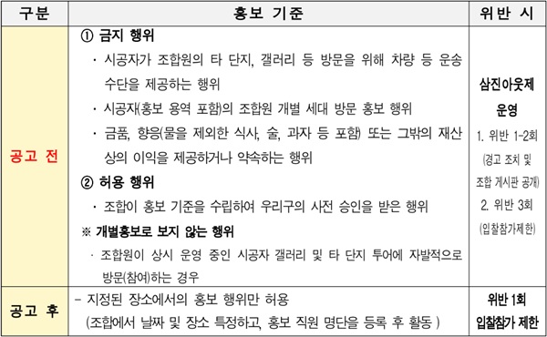 이에 따라 공고 전 조합은 구의 사전 승인을 받은 자체 기준 내에서만 예외적으로 홍보 활동이 가능하다. 금지되는 활동으로는 ▲단지 투어용 차량 제공 ▲홍보 인력의 세대 방문 ▲금품 및 향응(물을 제외한 식사, 술, 과자 등 포함) 또는 그밖의 재산상의 이익을 제공하고나 약속하는 행위 등이 있다. 만일 이를 위반하는 경우에는 삼진아웃제를 적용해 입찰참가 제한 등의 제재가 뒤따를 예정이다.