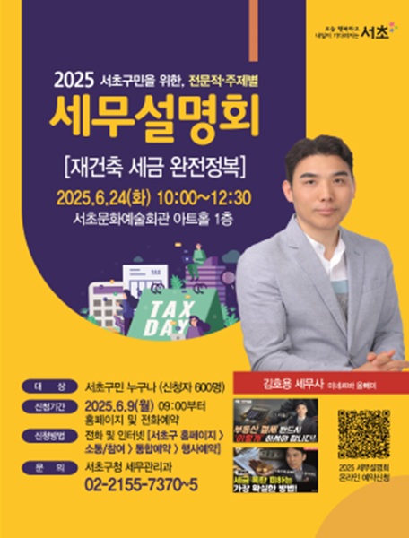 [아유경제=오수영 기자] 서울 서초구(청장 전성수)가 구민의 세무지식 함양을 위해 `주제별 세무설명회`를 개최한다.