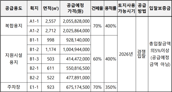공급 대상 토지는 ▲복합용지 2개 ▲지원시설용지 5개 ▲주차장용지 1개 등 총 8개 획지다.