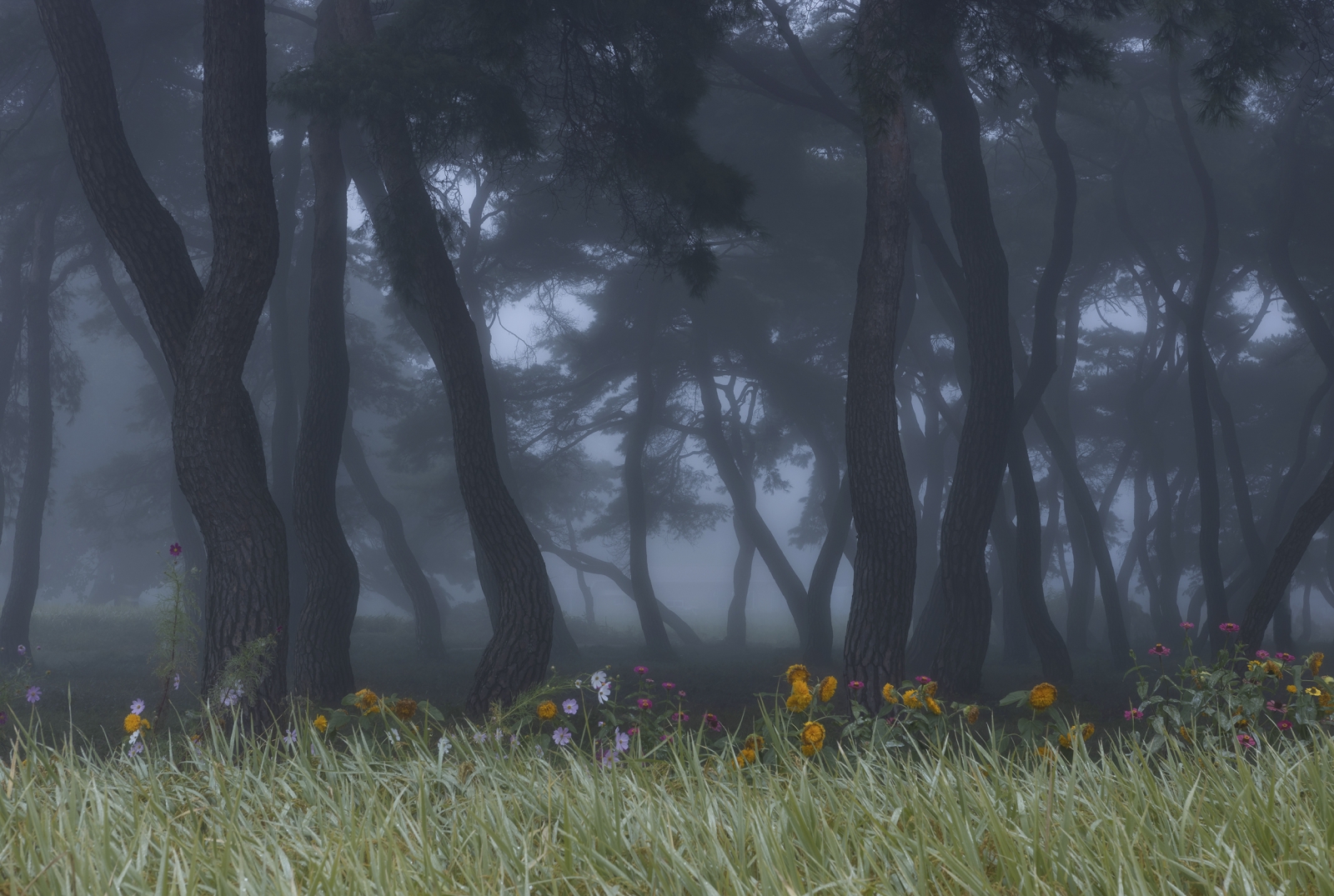 In the early hours of the morning, the Imhan-ri Pine Forest in South Korea is enveloped in a mystical fog, transforming the landscape into a scene of ethereal beauty. The fog diffuses the morning light, creating a soft, dreamlike glow that enhances the forest’s natural tranquility. The interplay of light and shadow, along with the muted colors of the foggy morning, evokes a sense of calm and introspection