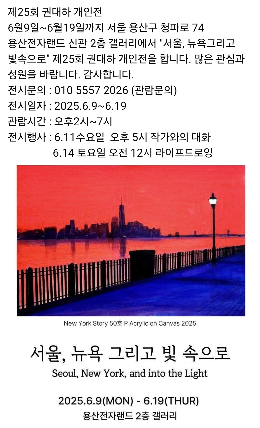 제25회 권대화 사진전 ‘서울, 뉴욕 그리고 빛 속으로’ 展이 아래와 같이 열립니다.