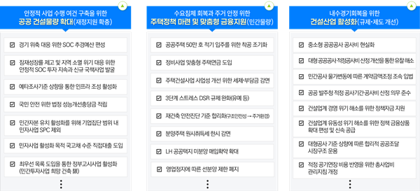 이러한 관점에서 내수경기 활력 제고를 위한 건설산업 활성화를 위한 정책 과제로 재정 지원 확충, 민간 수요 회복, 산업제도 개선을 제시했다.