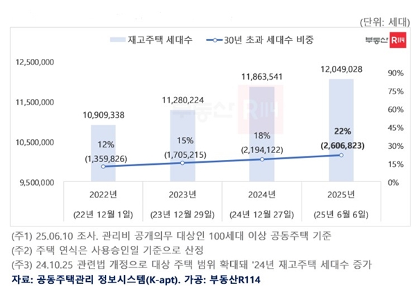 최근 부동산R114에 따르면 공동주택관리 정보시스템(K-apt) 자료를 분석한 결과 올해 전국 30년 초과 노후 주택은 260만6823가구로 전체의 22%를 차지하는 것으로 나타났다. 30년 초과 노후 주택 비중은 2022년 12%(135만9826가구), 2023년 15%(170만5215가구), 2024년 18%(219만4122가구)로 계속 증가하는 추세다.