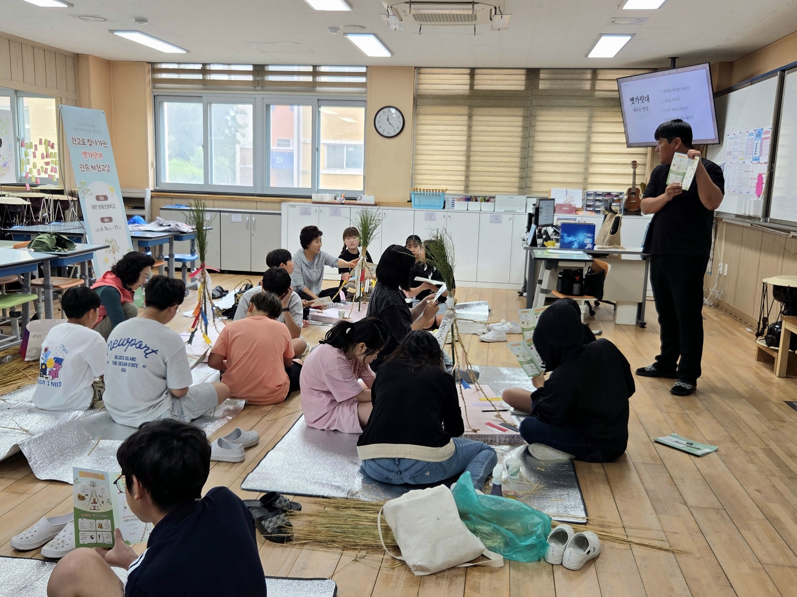 체험 교실은 볏가릿대 민속을 소개하는 강의와 학생들이 직접 볏짚으로 새끼줄을 꼬아 대나무·오곡 등을 이용해서 볏가릿대 모형 및 달걀 꾸러미 등을 만드는 내용으로 구성해 ‘볏가릿대 세우기’ 전반을 배우고 익힐 수 있도록 했다.