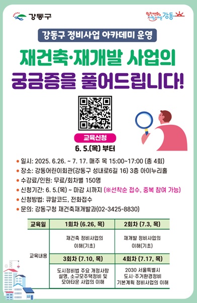 최근 강동구는 재개발ㆍ재건축 등 도시정비사업에 관심 있는 조합원과 주민들을 대상으로 `2025년 강동구 정비사업 아카데미`를 운영한다고 밝혔다.