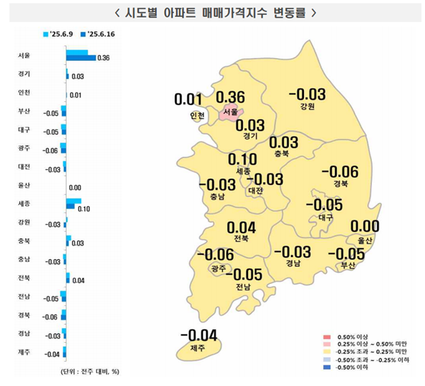 [아유경제=권혜진 기자] 최근 한국부동산원이 발표한 `주간아파트 가격동향`에 따르면 2025년 6월 3주(지난 16일 기준) 전국 아파트값은 상승(0.05%)을 기록했다. 수도권과 서울은 상승폭 확대, 지방은 하락폭 유지한 상황이다.