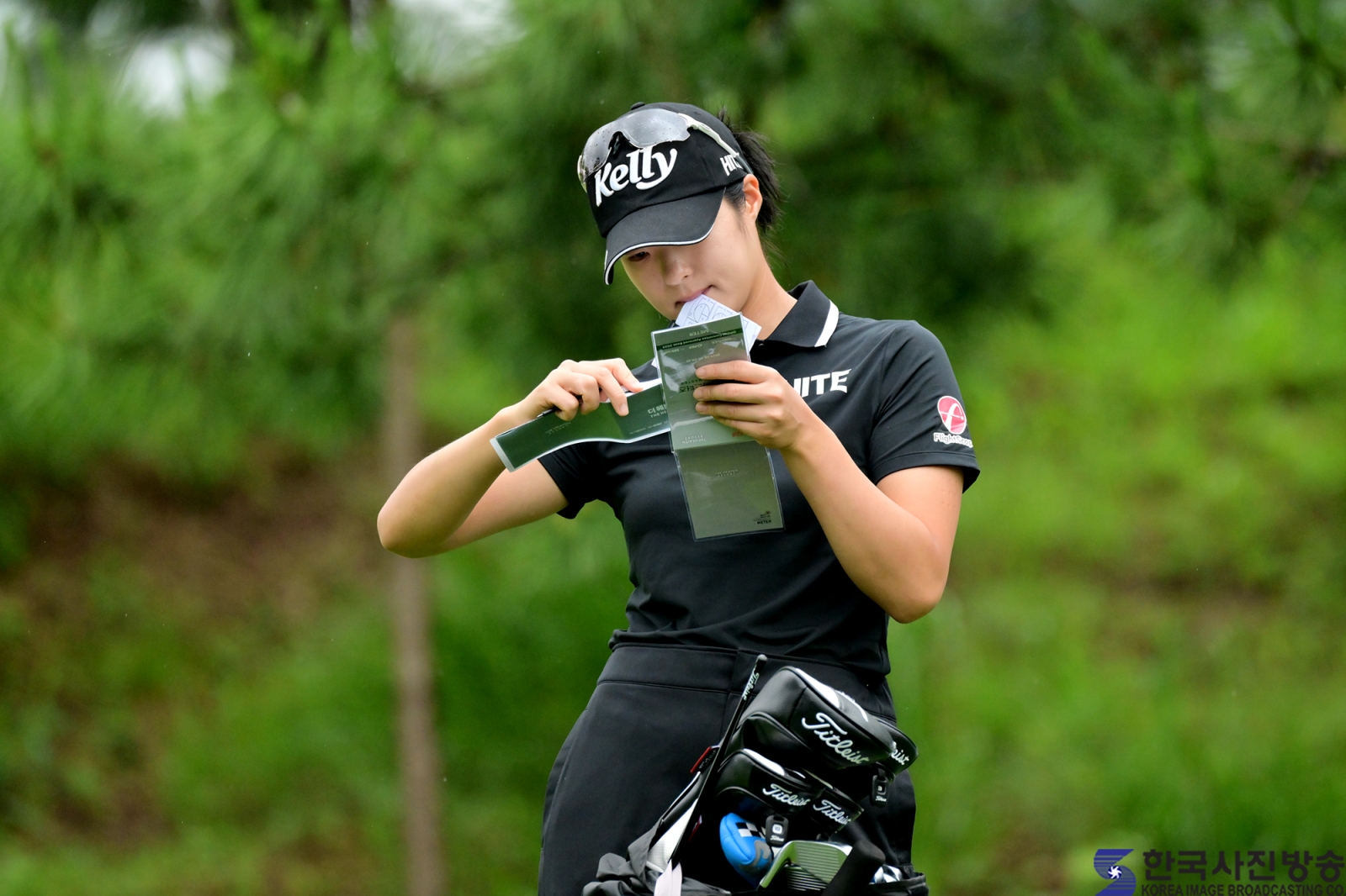 김민별 프로가 1번홀 티샷을 하기 전에 야디지 북을 보며 코스를 다시한번 점검하고 있다.