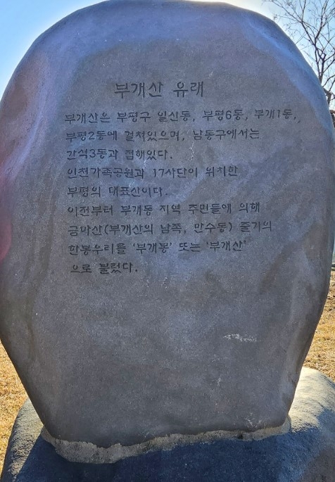 부개산 정상석 뒤에 있는 부개산의 유래를 보면, 부개산은 부평구 일신동, 부평6동, 부개1동, 부평2동에 걸쳐 있으며,