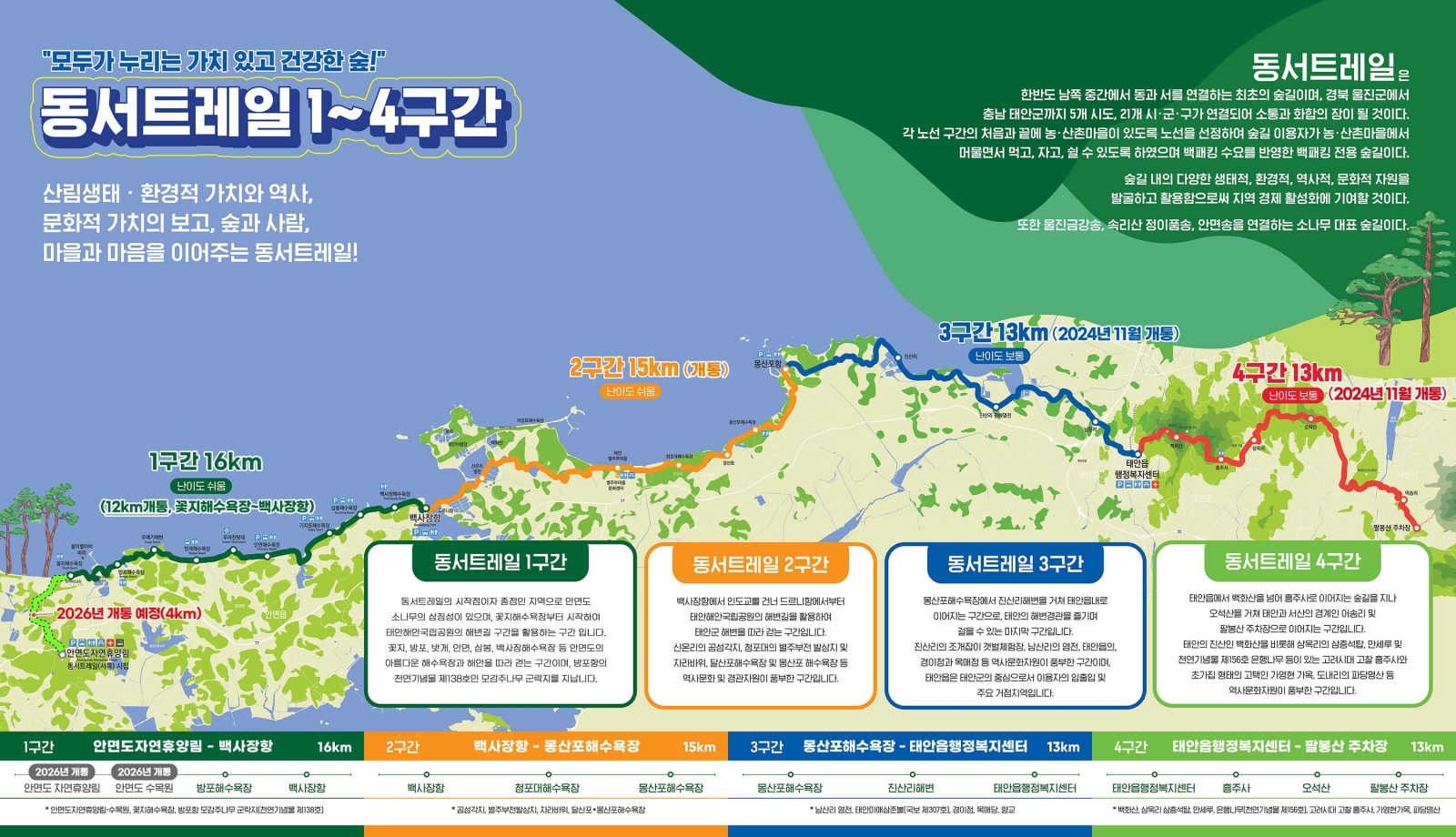 군에 따르면 태안군은 지난해 9월 동서트레일 1~4구간이 개통된 곳으로, 최근인 6월 18일에는 활성화 방안 논의를 위한 산림청 주관 ‘2분기 동서트레일 지속가능발전협의회’가 남면 별주부센터에서 개최되는 등 동서트레일의 핵심 도시 역할을 수행하고 있다.