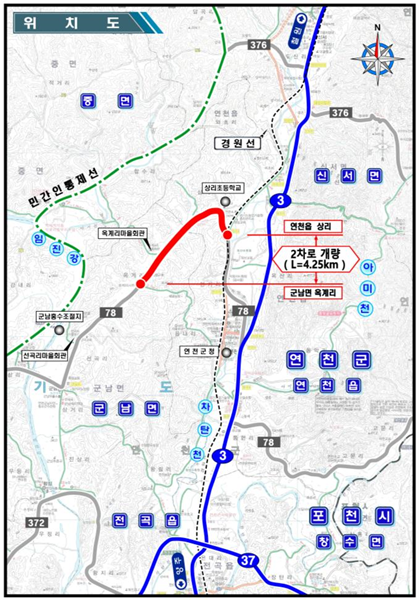 이번 사업은 2016년 준공한 `국지도 78호선 삼거~옥계 군 훈련도로 정비사업`의 연장선이자 마지막 잔여 구간에 해당한다. 총 217억 원의 예산을 투입해 연천 옥계리에서 상리간 국지도78호선의 좁은 차로 폭을 확장하고 교차로 4개를 새로 설치한다.