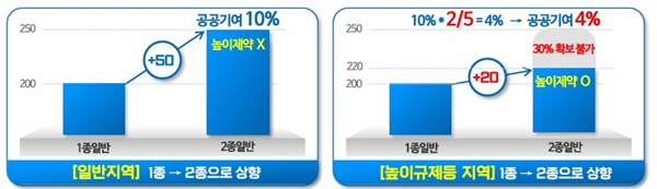 일반지역은 용도지역 1단계 상향 시 일률적으로 종상향 면적의 10%만큼 공공기여를 해야 하지만, 높이 규제로 인해 개발가능 밀도가 제한되는 지역은 추가 확보된 용적률만큼만 공공기여를 하면 된다. 사업 실현성 확보를 위해 필요하다고 인정될 때는 위원회 심의를 거쳐 이보다 더 완화된 공공기여율을 적용할 수도 있다.