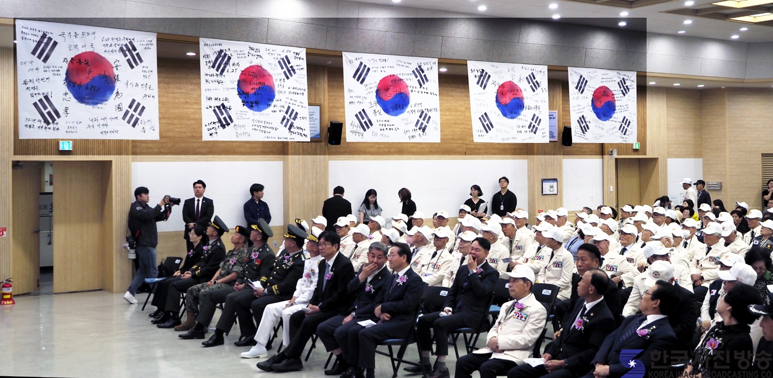 ▲ 행사장 좌우편에는 태극기 위에 참전유공자들이 직접 적은 글귀들 전시택극기에 써있는 글귀를 보는 내빈들