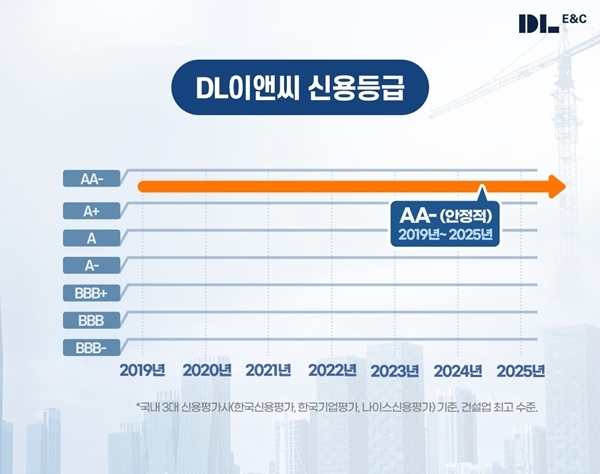 DL이앤씨는 2019년 6월 등급 부여 이래 7년 연속 AA- 등급을 유지했다.