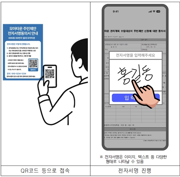 전자서명동의 방식은 추진 주체가 서비스 제공업체를 선정하고 시스템을 구축한 뒤 사업구역 정보를 등록하면 토지등소유자는 문자나 QR코드로 시스템에 접속해 본인 인증 후 동의서를 확인하고 전자서명을 제출하면 된다. 동의율은 실시간 집계 가능하며, 제출된 전자문서는 자동 암호화돼 안전하게 보관된다.