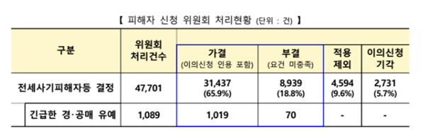 그간 위원회에서 최종 결정한 전세사기 피해자 등은 총 3만1437건이다. 긴급 경ㆍ공매 유예 협조요청 결정은 총 1019건으로, 결정된 피해자 등에게는 주거, 금융, 법적 절차 등을 지원한다.