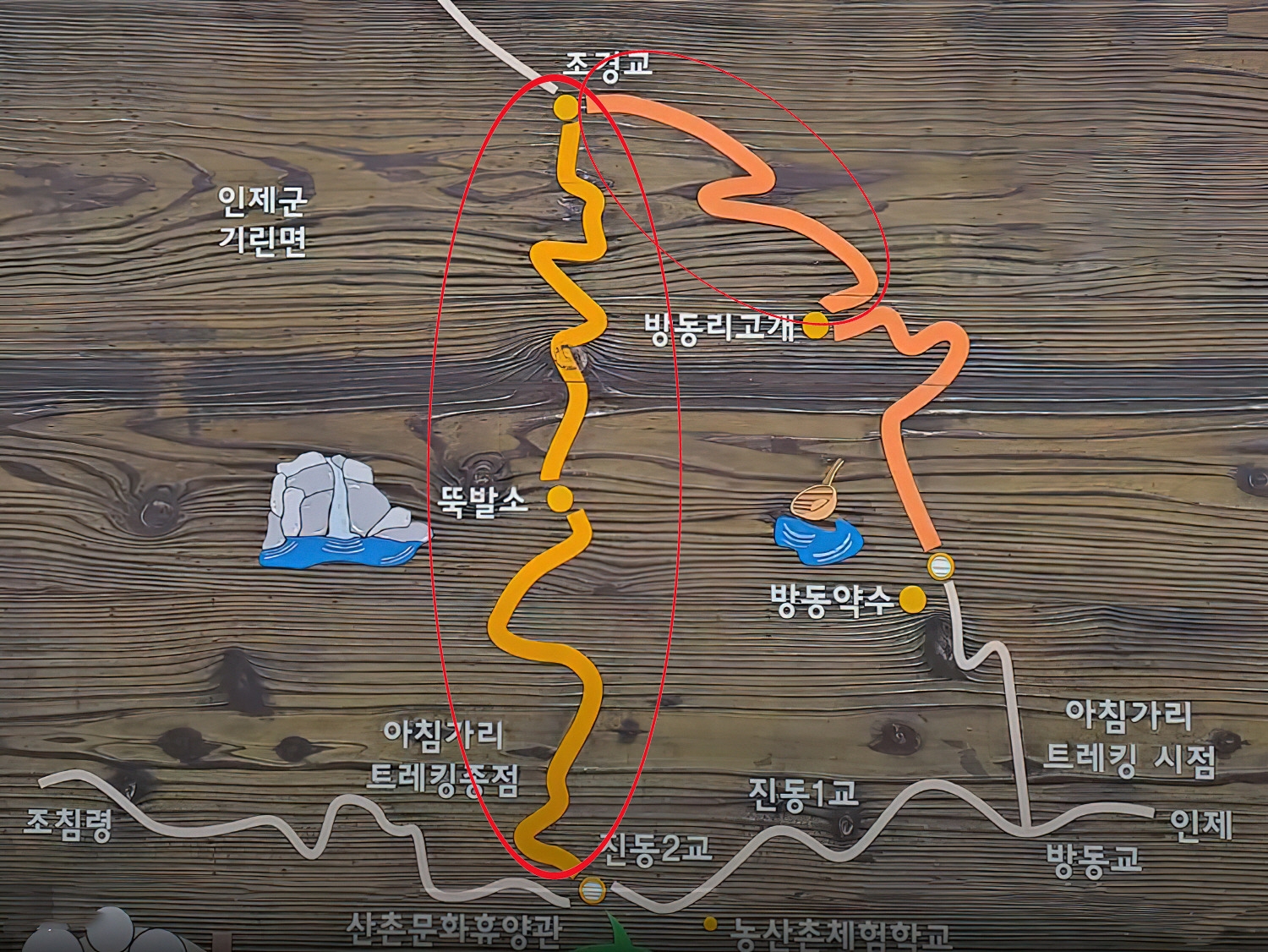 방동교-방동약수-방동고개-조경교 코스는 평범한 숲길 코스이기 때문에 지루함을 느낄 수가 있다. 가장 실속있는 아침가리골 트레킹 요령은 보통 진동1리 갈터쉼터 앞에서 택시로 방동고개까지 간 후(택시비 35,000원 정도로 비싼 편) 방동고개에서부터 본격적인 트레킹을 시작하는 방법이다. 방동고개는 자동차로 갈 수 있는 마지막 지점인데 차도 폭이 좁아 택시 수준의 작은 차 만 진입이 가능하다. 방동고개에서 조경교까지는 약 1시간 정도 편한 내리막숲길이다. 방동고개에서 인적사항을 신고한 후 출발한다.