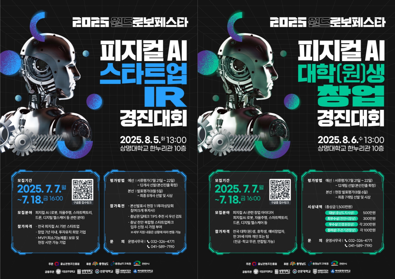 충남콘텐츠진흥원(원장 김곡미)은 오는 8월 5일 천안(상명대학교)에서 개최되는 ‘2025 월드 로보 페스타’의 주요 프로그램으로『피지컬AI 스타트업 IR 경진대회』와 『피지컬AI 대학(원)생 창업 경진대회』를 동시 개최하며 이에 참여할 참가팀을 모집한다고 밝혔다.