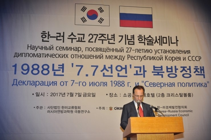 지난 7월7일 오전 서울 소공동 롯데호텔 2층 크리스털 볼룸에서 한러교류협회 안외선 박사의 사회로 한-러 수교 27주년 기념학술세미나 “1988년 7.7 노태우 대통령선언과 북방정책”이 열렸다.