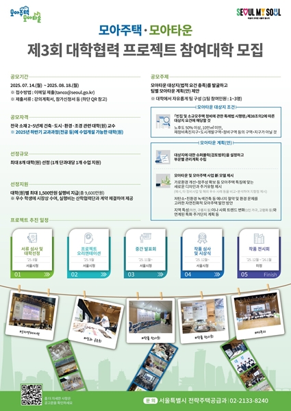 [아유경제=조명의 기자] 서울시는 `제3회 대학협력 모아주택ㆍ모아타운 프로젝트`에 참여할 전국 건축ㆍ도시ㆍ환경ㆍ조경 관련 대학(원)을 모집한다고 이달 14일 밝혔다.