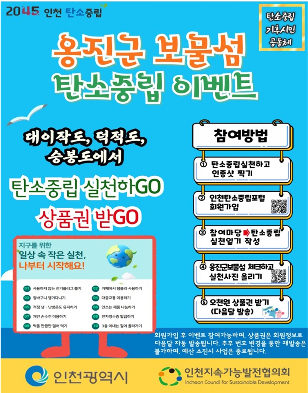 참여 방법은 인천탄소중립포털(www.innetzero.or.kr)에 회원가입 후‘탄소중립 실천일기 작성’ 메뉴에서 ‘옹진군 보물섬 탄소중립 이벤트’를 선택하면 된다. 해변 쓰레기 줍기, 텀블러 사용 등 다양한 탄소중립 실천 활동을 사진으로 인증하면, 선착순 300명에게 5,000원 상당의 모바일 상품권이 제공된다.