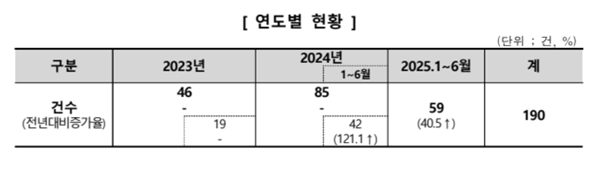 지역별로는 경기도 68건(35.8%), 대전 22건(11.6%), 서울 17건(8.9%), 충북 16건(8.4%), 충남 14건(7.4%), 인천 12건(6.3%) 순으로 많았다.