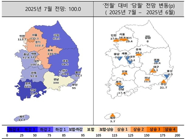 수도권은 전월(98.3)보다 25.4p 상승한 123.7로 전망됐다. 경기 29.4p(92.8→122.2), 서울 28.9p(106.2→135.1), 인천 17.9p(95.8→113.7) 순으로 올랐다. 특히 서울 지수가 130을 넘은 것으로 2017년 6월(131.8) 이후 8년 1개월 만이다.