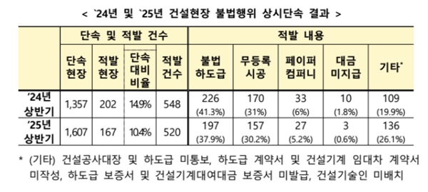 국토부 관계자는 "앞으로도 건설현장의 불법 행위에 대해 강도 높은 상시 단속을 실시하고 적발 시 무관용의 원칙으로 엄정 처리하겠다"라며 "현장에서도 공정하고 안전한 건설환경 조성을 위해 노력해달라"고 당부했다.