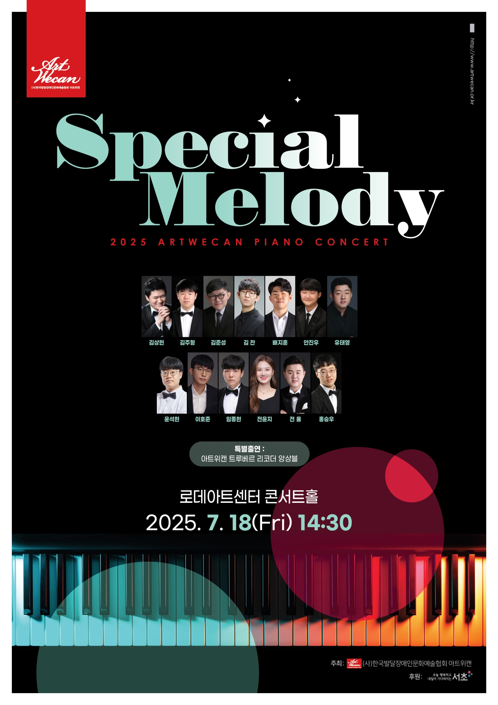 (사)한국발달장애인문화예술협회 아트위캔(이하 아트위캔, 대표 왕소영)은 2025년 서초구 사회복지기금(장애인복지계정) 공모사업으로 ‘2025 아트위캔 피아노콘서트 <스페셜 멜로디(Special Melody)>’를 오는 7월 18일(금) 오후 2시 30분 서울시 서초구에 위치한 로데아트센터 콘서트홀에서 개최한다.