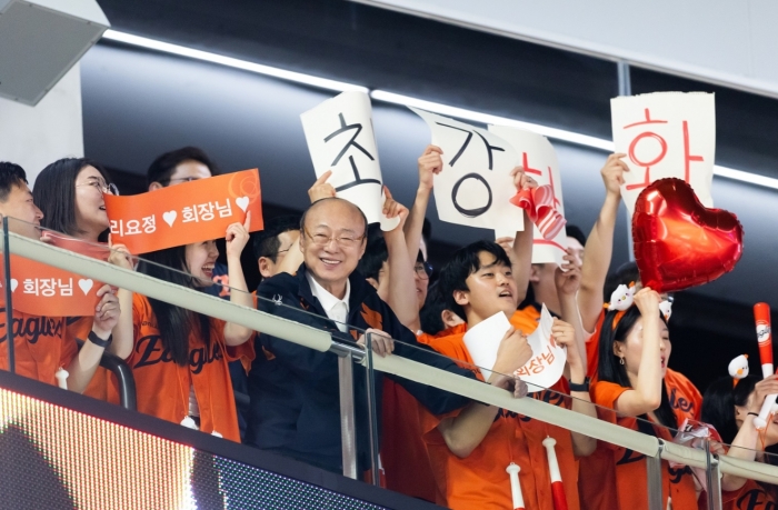 이날 김 회장은 접전이 이어지던 8회부터 연장 11회 경기 종료까지 직원들과 함께 호흡하고, “최강 한화”를 외치며 응원했다.