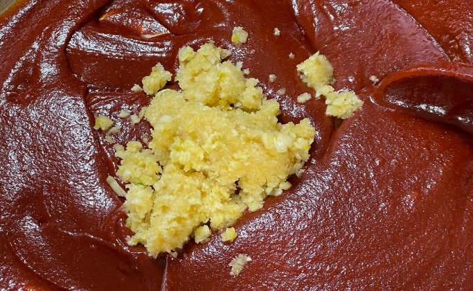 10. 찹쌀고추장 만들어진데 마늘을 넣고 섞으면 마늘고추장 완성이다.