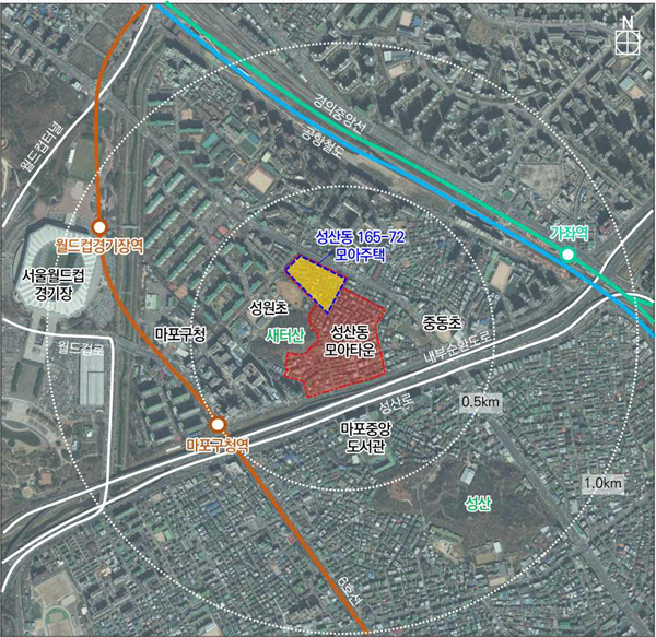 이곳은 지하철 6호선 마포구청역과 가깝고 성원초등학교 인근에 위치해 교육환경도 우수한 편이다. 또한 인근 성산동 200-413 일대도 조합설립인가를 앞두고 있어 모아타운 내 연계 개발이 본격화될 전망이다.